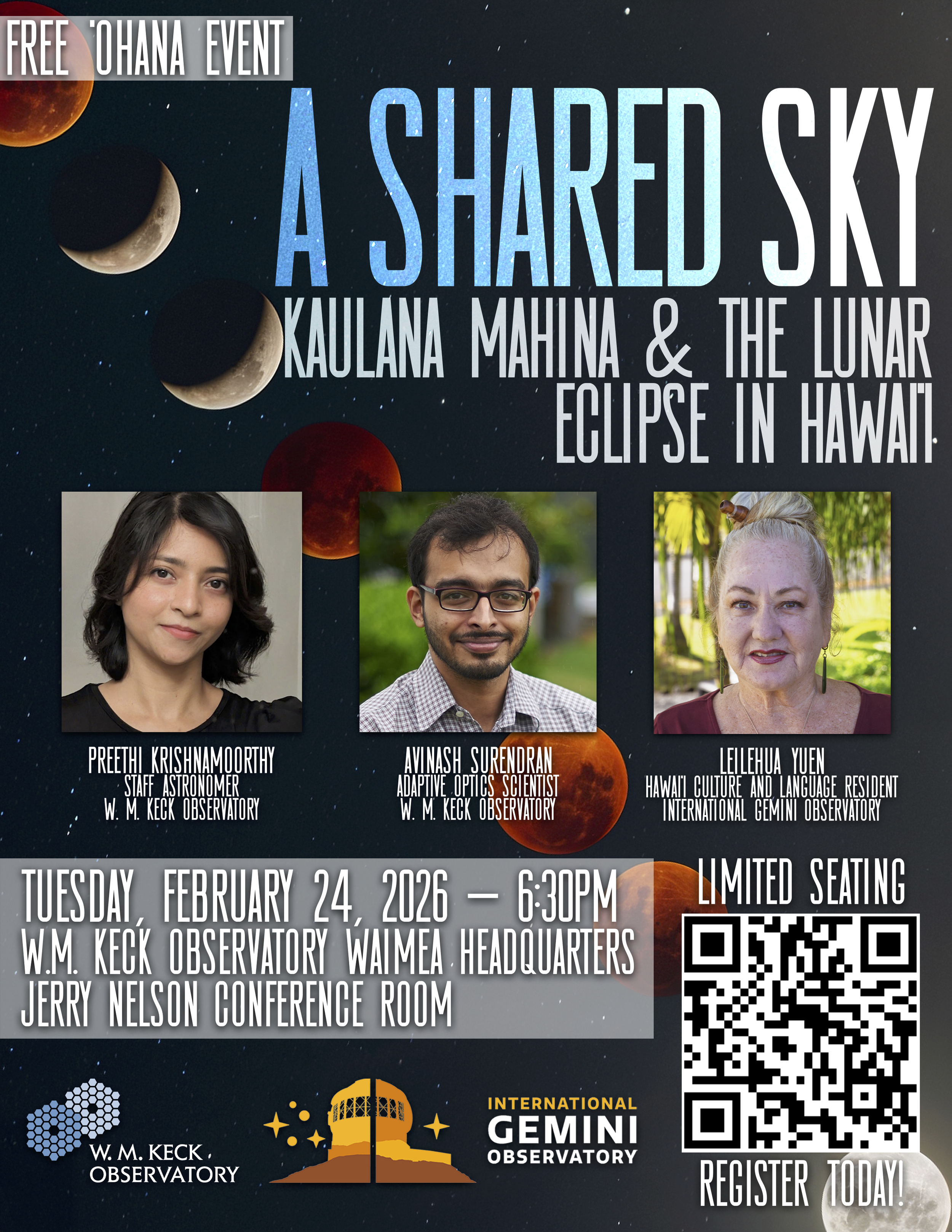 Join W.M. Keck Observatory and International Gemini Observatory on Tuesday, February 24, at 6:30 pm for A Shared Sky: Kaulana Mahina and the Lunar Eclipse in Hawaiʻi. This free ʻohana event is in anticipation of the upcoming total lunar eclipse (Blood Moon) on March 13/14 and will feature a talk and Q&A with three speakers from the observatories.