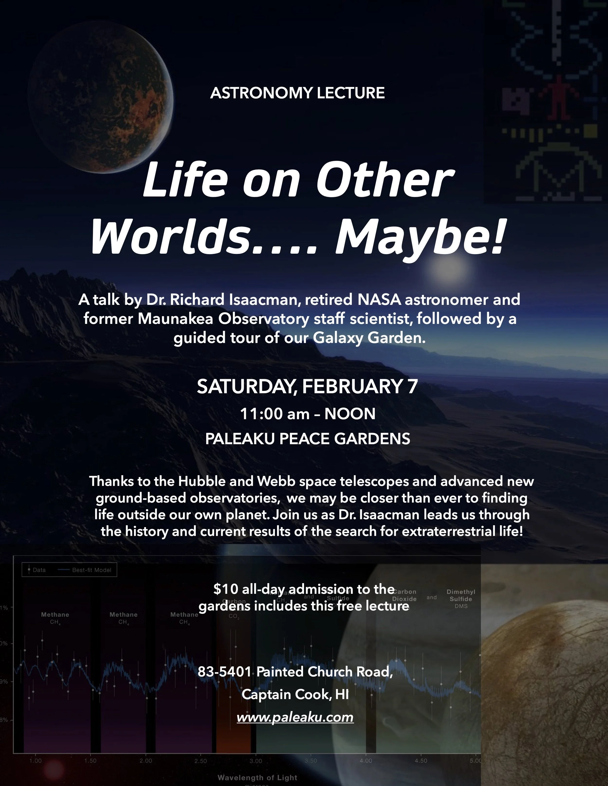 Paleaku Gardens Peace Sanctuary is hosting an astronomy lecture on Saturday, February 7, from 11:00a to 12:00p, featuring Dr. Richard Isaacman, a retired NASA astronomer and former Maunakea Observatory staff scientist.