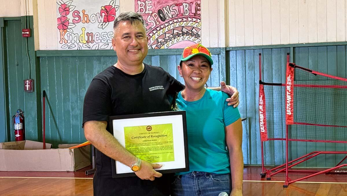 Naʻalehu Elementary School Principal Wilma Roddy (right) presents Christian Wong (left) with a Certificate of Recognition from the County of Hawaiʻi for organizing a series of science outreach events at schools in remote areas during "Rocketry Day" on April 26, 2024. - Courtesy of NAOJ